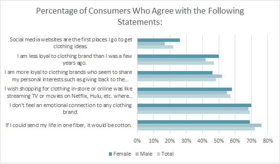Add to that a strange new dynamic where nearly half of all consumers (47 percent) freely admit they’re less loyal to clothing brands than they were a few years ago, and almost 7 out of 10 (69 percent) say they don’t feel an emotional connection to any clothing brand, according to the Cotton Incorporated Lifestyle Monitor™ Survey. Additionally, more than half of all consumers (57 percent) say they wish shopping for clothing was like streaming TV or movies on Netflix or Hulu, where they can get “whatever I want, whenever I want it.”