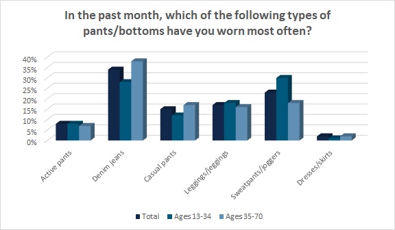 Of all the pants and bottoms they own, consumers say they have worn denim jeans the most (34 percent) in the past month, according to the Cotton Incorporated Lifestyle Monitor™ Survey, with men wearing them significantly more than women (40 percent versus 30 percent). That compares to sweatpants/joggers (23 percent), leggings/jeggings (17 percent), casual pants (15 percent), active pants (8 percent), and dress pants (2 percent).
