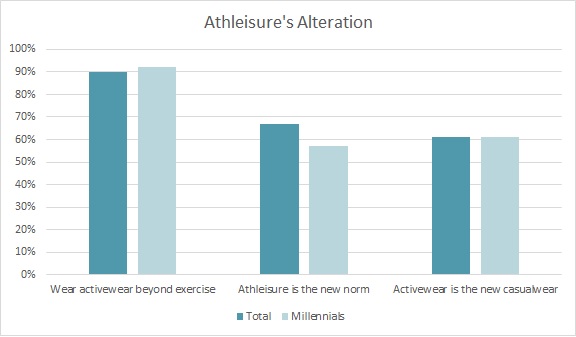The Activewear study also shows that consumers seem to be replacing their non-active exercise apparel — say, non-active shorts and tees — with activewear. From 2014 to 2016, average activewear ownership increased from 30 garments to 33 garments, while average non-active for exercise ownership declined from 35 garments to 30 garments. Increases in active product ownership came from socks, bras, and compression garments.