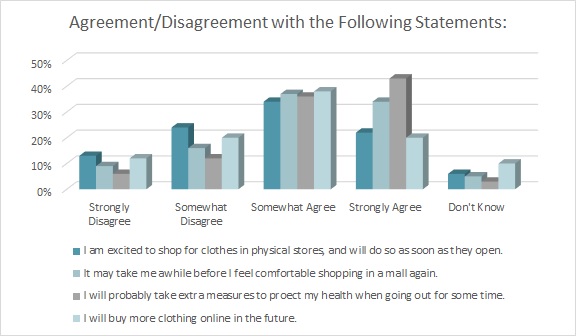 The threat of the coronavirus led to nearly 8 in 10 shoppers (79 percent) saying that for some time they expect to take extra measures to protect their health when going out, e.g., face masks, hand sanitizer, according to the Cotton Incorporated 2020 Coronavirus Response Survey (Wave 2 April 27-30). Further, 71 percent of respondents say it may take them a while before they feel comfortable shopping in a mall again.