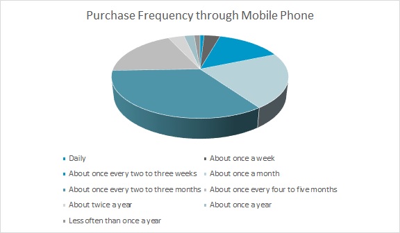 More than one-third (34 percent) of Chinese consumers buy clothes with their mobile phone about once every 2-to-3 months, according to the China Consumer Research. Another 21 percent buy via phone once a month, 18 percent purchase once every 4-to-5 months and 14 percent make a smartphone purchase every 2-to-3 weeks.