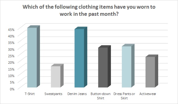 As much as consumers have loved working in their sweatpants at home, just 16 percent have worn them to work in the last month, according to the Coronavirus Response Survey (Wave 10). On the other hand, 39 percent have worn denim jeans to their office. About 36 percent have worn dress pants or a dress skirt. Activewear or athletic apparel has been worn by 22 percent of office workers, while 18 percent have donned khakis or chinos.
