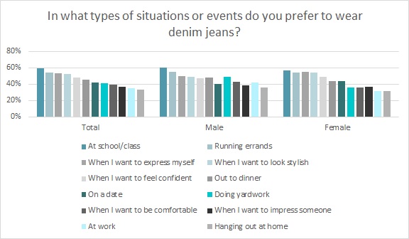 More than half of all consumers (53 percent) say they wear jeans when “I want to express myself,” according to the Monitor™. Another 52 percent wear denim when they “want to look stylish,” while 48 percent wears it when they want to feel confident. More than 4 in 10 men (42 percent) specifically wear jeans to work, as do 31 percent of women.