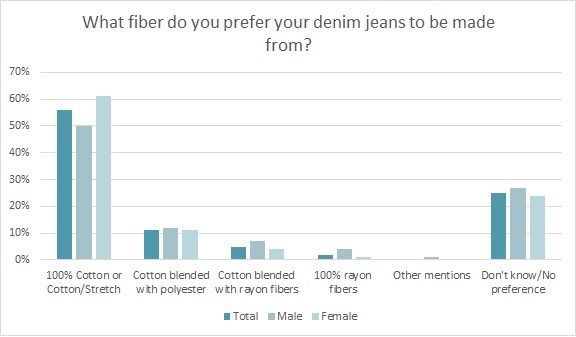 Nearly 3 in 5 consumers (56 percent) prefer their denim jeans be made from 100 percent cotton or cotton blended with stretch fibers, according to the Cotton Incorporated Lifestyle Monitor™ Survey. Just 11 percent want their denim blended with polyester, and it’s even less for rayon (5 percent).