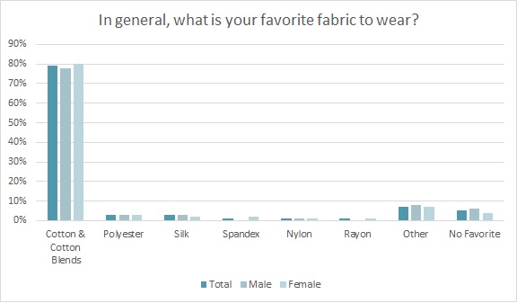 Regardless of season, consumers cite cotton and cotton blends (79 percent) as their favorite fabrics to wear, according to Monitor™ data. This far outweighs the next closest fabrics: polyester and silk (both 3 percent) and spandex, nylon, and rayon (all 1 percent).