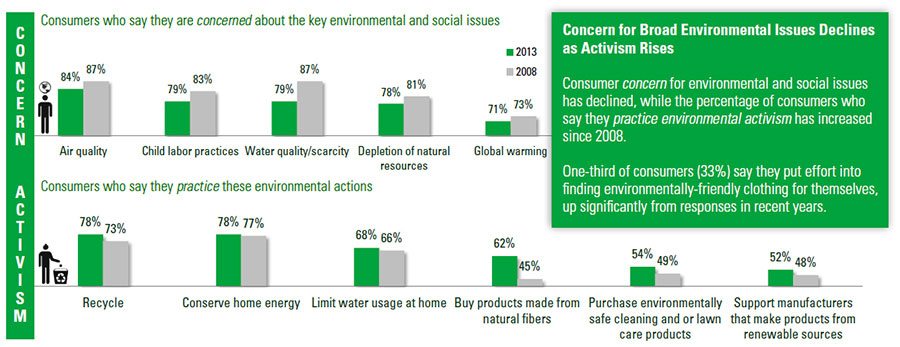 Consumers’ environmentally-conscious actions tend to focus on areas that they have some perceivable sense of control, impact, or direct financial savings.  Consumers indicate that their participation in eco-friendly habits such as recycling, turning off lights to conserve energy, and using less water, has steadily increased. In contrast, consumer concern about global environmental and social issues such as air quality, water quality/scarcity, and global warning has decreased, compared to six years ago. In regards to buying clothing, environmental-friendliness is still not a primary purchase driver for consumers, but more than two-thirds of shoppers (70%) would be bothered if they found out an item of clothing that they purchased was produced in Consumer Environmental Concern and Activisma non-eco-friendly way.