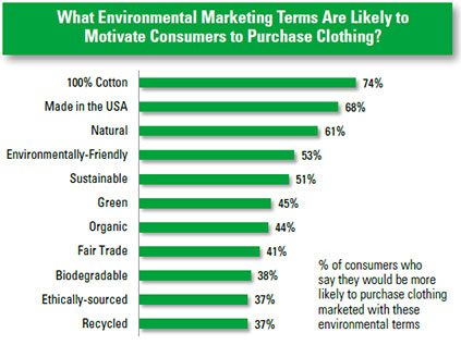 Consumers believe that domestically manufactured clothing is better for the environment than apparel made overseas. Half of consumers (50%) think that clothing imported from other countries is less eco-friendly than clothing made in the USA. Consumers say the primary reasons that products manufactured in the U.S. are more environmentally-friendly isInfluential Environmental Marketing Terms due to domestic regulation and environmental protection laws that other countries may not have or do not enforce. For American consumers, buying domestically manufactured clothing satisfies their desire to act in eco-friendly ways and to support the national economy.