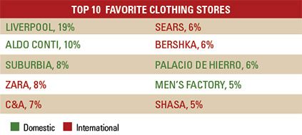 A large segment of Mexican consumers (61%) favor domestic clothing stores (e.g., Liverpool, Aldo Conti, and Suburbia, etc.) and an equal number (61%) say that their favorite clothing brands (e.g., Zara, Sasha, and Polo, etc.) are international. Although some domestic clothing brands such as Oggi Jeans and Aldo Conti rank high among consumers, international brands are preferred among women, youth, SEL AB, and consumers who mostly shop at specialty stores. Allegiance to national stores may be influenced by a sense of cultural connection and int