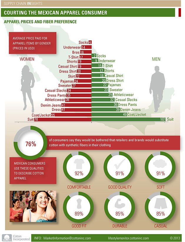 Cotton Incorporated’s Mexico Consumer Survey was conducted through telephone interviews among 900 consumers living in Mexico City. Respondents were male and female, ages 15-50, in socioeconomic groups AB, C+, and C, and shopped for most of their clothing at supermarket, department, or specialty stores. Research was conducted in the fall of 2012 by Ipsos.