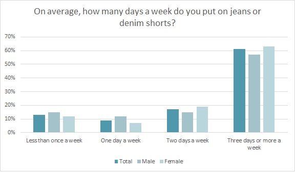 That versatility is what, after nearly a century-and-a-half, makes denim jeans so popular. Almost 2 in 3 consumers (61 percent) say they wear denim jeans/shorts at least three times a week, according to the Cotton Incorporated Lifestyle Monitor™ Survey. Nearly three-quarters of all consumers (72 percent) say denim is their first pick for casualwear. About half prefer to wear jeans to run errands (58 percent), school or class (54 percent), express themselves (51 percent), feel confident (47 percent), and go out to dinner and feel stylish (both 42 percent).