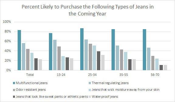 About half of all consumers plan to purchase jeans with thermal regulating (56 percent) and odor resistant (44 percent) properties in the coming year, according to Monitor™ data. That’s followed by jeans that have moisture wicking (36 percent), as well as active inspired (25 percent), and waterproof (23 percent) denim.