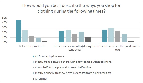 But in the future when the pandemic is actually over, just 26 percent of consumers expect to buy all their clothes from a physical store, according to the Coronavirus Response Survey (Wave 7). Rather, the largest segment (29 percent) expects to buy mostly from brick and mortar stores with a few items purchased online, and 24 percent expect to buy half online, half in-store.