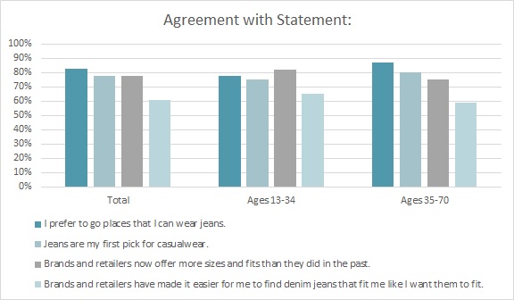 For nearly 8 in 10 women (79 percent), denim jeans are their first pick for casualwear, according to the Monitor™ data. And after years of taking a back seat to yoga pants or leggings, most women (80 percent) say brands and retailers now offer more sizes and fits than they did in the past.
