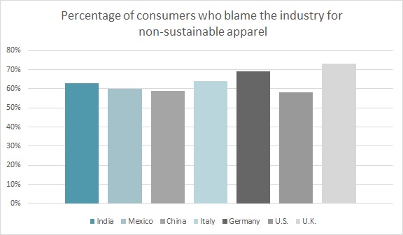 Jenkins isn’t the only one seeking more accountability from clothing brands. Worldwide, consumers are starting to look at the apparel industry’s role in sustainability and the environment. When it comes to non-sustainable apparel, 73 percent of U.K. consumers blame the industry, according to the Monitor™ research. That’s followed by 69 percent of consumers in Germany, 64 percent in Italy, 63 percent in India, 60 percent in Mexico and 59 percent in China. At 58 percent, U.S. consumers were least likely to blame the apparel industry for non-sustainable clothes.