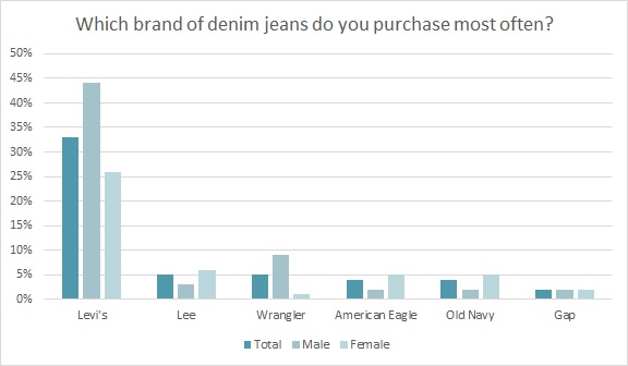 Levi’s are the favorite brand of jeans among U.S. consumers (33 percent), followed by Lee (5 percent), Wrangler (5 percent), American Eagle (4 percent), Old Navy (4 percent) and Gap (2 percent), according to the Cotton Incorporated Lifestyle Monitor™ Survey.