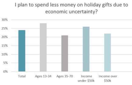 All told, 40 percent of holiday shoppers say COVID-19 will cause them to spend less on holiday gifts this year. About a quarter of shoppers (24 percent) say they plan to spend less on gifts because of economic uncertainty. Another quarter of shoppers (26 percent) plan to spend less because they have less money. And another 22 percent plan to spend less because they’re saving their money.