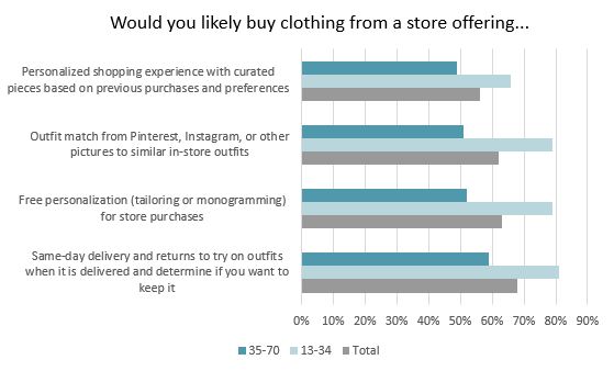 Although most consumers already enjoy shopping for clothes, that doesn’t preclude them from having suggestions about how to make the experience better. For example, 68 percent of people would buy from a store that offers same day delivery and returns, allowing shoppers the opportunity to try on an outfit when it’s delivered to determine if they want to keep it, according to the Cotton Incorporated November 2021 Lifestyle Monitor™ Survey. Another 62 percent would shop stores that offered the ability to match a picture of an outfit seen on social media to a similar outfit offered at that store. And 56 percent would like a personalized shopping experience with collections pulled together based on their previous purchases and preferences.