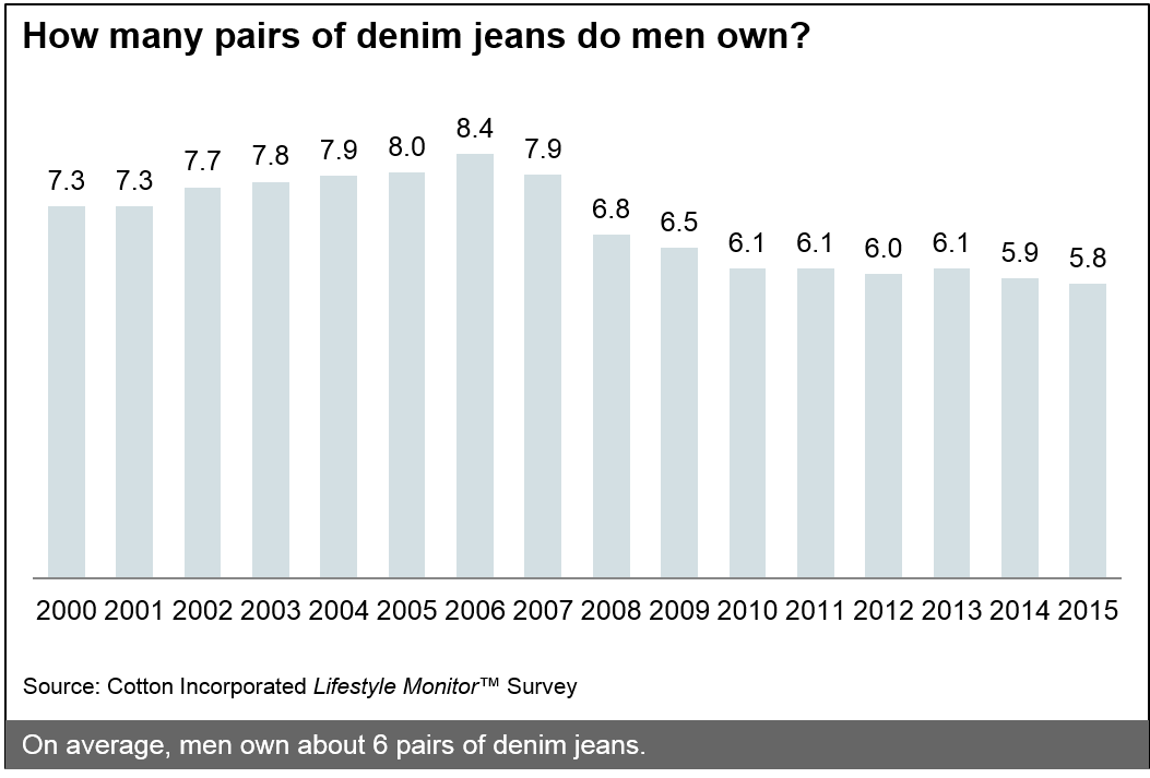 Home > Consumers > How many pairs of jeans do men own?How many pairs of jeans do men own? January 29, 2016Denim How many pairs of jeans do consumers own?How many pairs of jeans do women own?