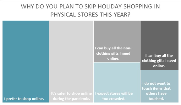 Almost 9 out of 10 holiday shoppers say they plan to shop online for gifts the same (66 percent) or more (27 percent) this year compared to last year, according to the Cotton Incorporated 2021 Lifestyle Monitor™ Survey. Holiday shoppers who do not plan to shop in-store say it’s because they prefer to shop online (49 percent), or they feel it’s safer to use ecommerce during the pandemic (45 percent). The safety concern is down, though, from 65 percent in 2020.