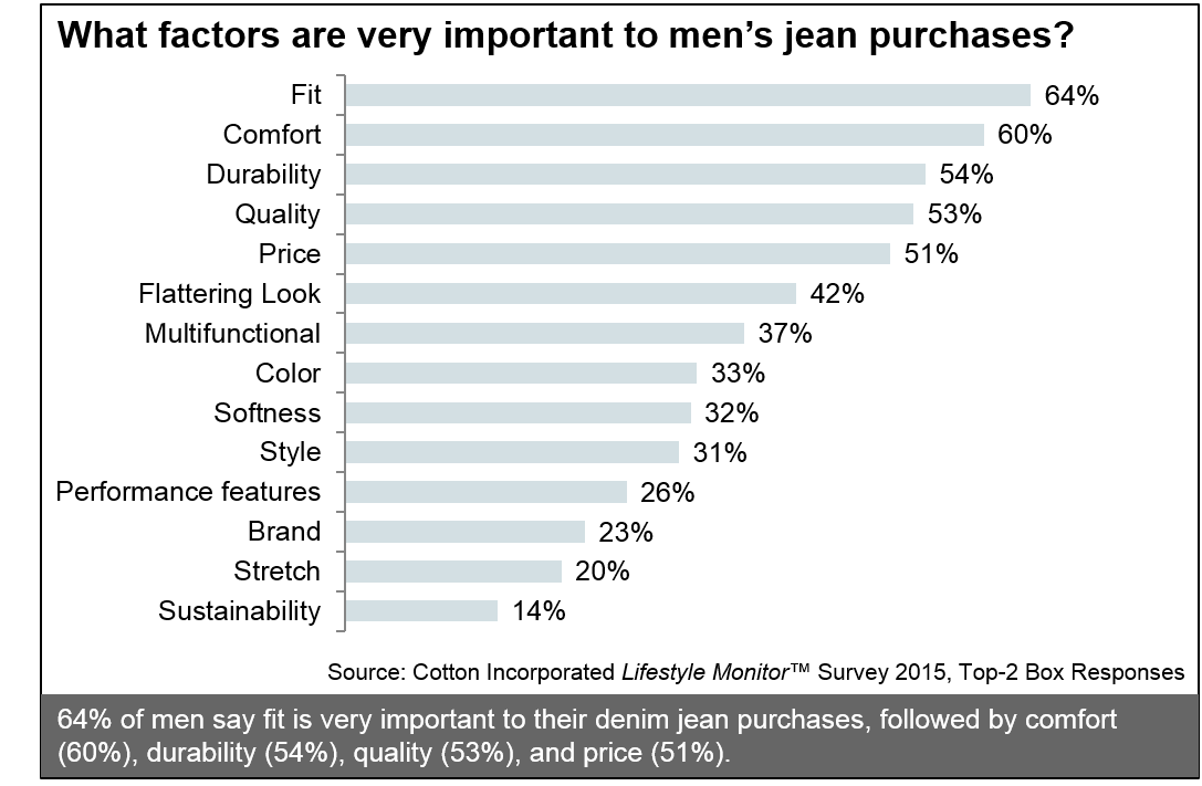 Home > Consumers > Important Factors for Men’s Jeans PurchasesImportant Factors for Men’s Jeans Purchases February 1, 2016Denim Important Factors When Purchasing JeansImportant Factors for Women's Jeans Purchases