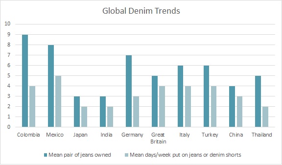 On average, men and women in the U.S. own 6 pairs of denim jeans, according to the Monitor™ research. In contrast, consumers in denim-loving Colombia own 9 pairs. That’s followed by Mexico (8 pairs), Germany (7 pairs), Italy and Turkey (both 6 pairs), Great Britain and Thailand (both 5 pairs), China (4 pairs), and Japan and India (3 pairs).