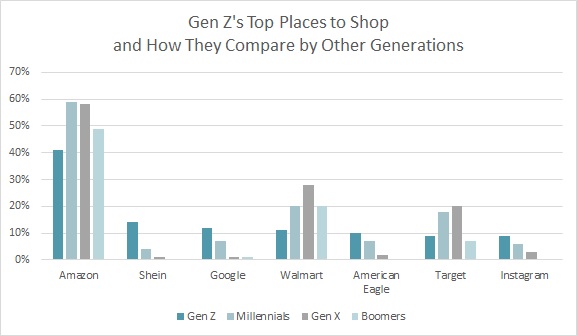 Even more, 41 percent of Gen Z shoppers name Amazon as their top site for buying clothes online, according to the Monitor™ survey. That’s trailed by fast-fashion ecommerce retailer Shein (14 percent), Google (12 percent), Walmart (11 percent), American Eagle (10 percent), and Target and Instagram, (both 9 percent), among others.