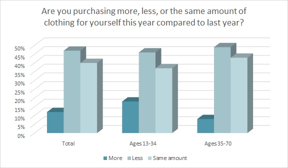 This could be related to personal income changes. The Monitor™ finds that 2 in 5 consumers (40 percent) say they have less money to spend on clothes this year. More women (41 percent) than men (37 percent) say they have less money for clothing purchases this year.