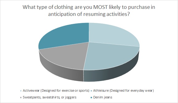 More than half of all consumers (53 percent) say they plan to purchase activewear (29 percent) or athleisure apparel (24 percent) in anticipation of resuming activities, according to Cotton Incorporated’s 2021 Coronavirus Response Consumer Survey (Wave 5, Feb. 28, 2021). Nearly one-quarter of shoppers (23 percent) plan to buy T-shirts. Another 20 percent plan to buy leggings, jeggings, or yoga pants. And about 1 in 5 (19 percent) plan to purchase sweatpants, sweatshirts, or joggers.