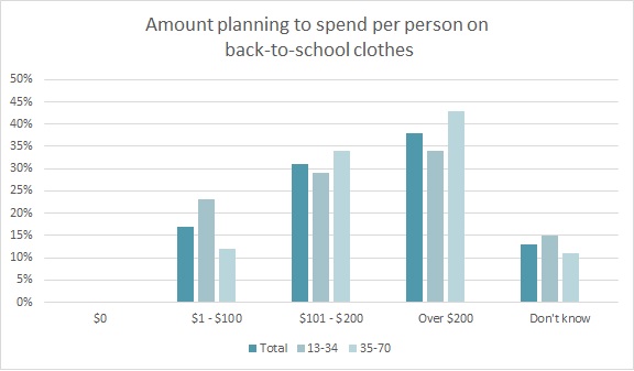 This year, families will spend $277 per person on BTS clothes, up 4 percent from 2017, according to the Cotton Incorporated Lifestyle Monitor™ Survey. Perhaps surprisingly, planned spending by males ($353) is significantly higher than the amount females ($239) plan to spend.