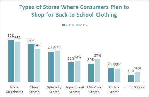 Consumers are likely to come across these events in their search for the perfect jeans and tees. The Monitor shows 66% plan to shop for school clothes at mass merchants, followed by chain stores (54%), specialty stores (51%), off-price stores (37%) and department stores (34%).