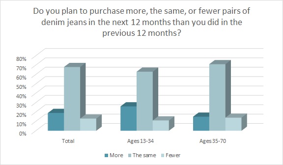That growth stems from the fact that nearly 9 out of 10 consumers (87 percent) say they plan to purchase the same amount or more denim jeans over the next year, according to the Cotton Incorporated Lifestyle Monitor™ Survey. About one-fifth (19 percent) say they plan to purchase more jeans. And shoppers under the age of 35 are significantly more likely than their counterparts to say they expect to pick up more denim (26 percent versus 15 percent).