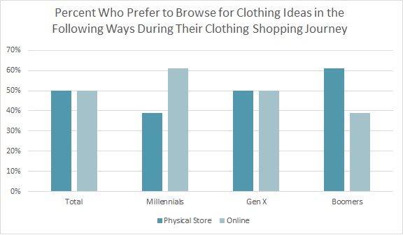 When purchasing new clothes, the top purchasing factor is fit (97 percent), followed by comfort (96 percent), and then price (93 percent), according to the Cotton Incorporated Lifestyle Monitor™ Survey. That explains why the large majority of consumers (75 percent) still prefer to purchase their apparel in a physical store. However, when it comes to browsing, consumers are equally split between browsing online or in-store (both 50 percent).
