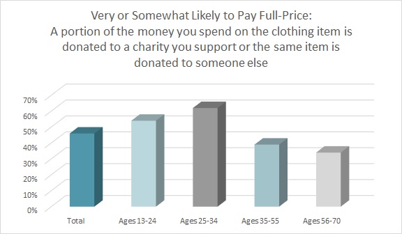 And that can make a big difference at a time when, as McKinsey points out, consumers continue to be careful with their spending. See, nearly half of all shoppers (46 percent) say they would be willing to pay full-price for an item if a portion of the money they spend is donated to charity or the same item is donated to someone else, according to the Cotton Incorporated Lifestyle Monitor™ Survey. The sentiment was highest (62 percent) among younger consumers aged 25-to-34, followed by those aged 13-to-34 (54 percent). That view decreased significantly as shoppers got older, dropping to 39 percent among those 35-to-55 and to 34 percent among those 56-to-70 years old.