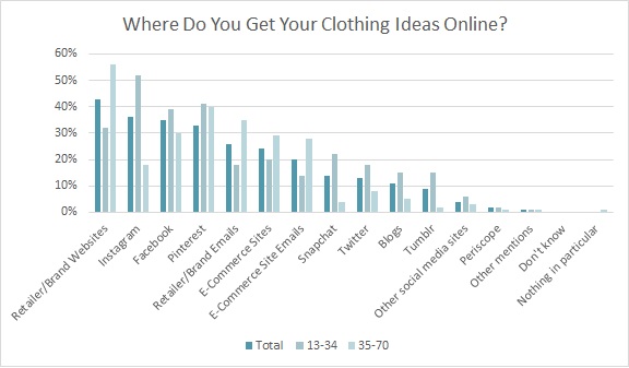 Once online, consumers get their apparel ideas mostly from retailer or brand websites (43 percent), according to the Monitor™ research. That’s followed by Instagram (36 percent), Facebook (35 percent), Pinterest (33 percent), emails from brands and retailers (26 percent), e-commerce sites like Amazon, eBay and Rue La La (24 percent), emails from e-commerce sites like Amazon, etc. (20 percent), Snapchat (14 percent), Twitter (13 percent), and Tumblr (9 percent).