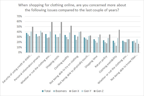 Also, consumers are skittish about shopping for apparel online because they say in the last couple of years they’ve become more concerned with a number of issues, including the security of using credit or debit cards (38 percent) and personal information privacy (36 percent), according to Monitor™ research. They’re also more concerned with whether or not the clothes will fit (36 percent), shipping costs (35 percent), clothing quality (34 percent), not being able to try on the clothes (34 percent), not being able to physically touch the clothes (29 percent), shipping time (26 percent) and return policies (24 percent).