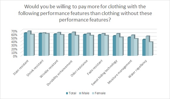 Not only do consumers seek out these features, but the Monitor™ survey shows the majority are willing to pay more for activewear that’s stain resistant (63 percent), shrink resistant (62 percent), wrinkle resistant (60 percent), and has durability enhancement (60 percent). They would also pay a premium for workout clothes that are odor resistant (59 percent), fade resistant (58 percent), have sweat-hiding technology (55 percent), and moisture management (51 percent).