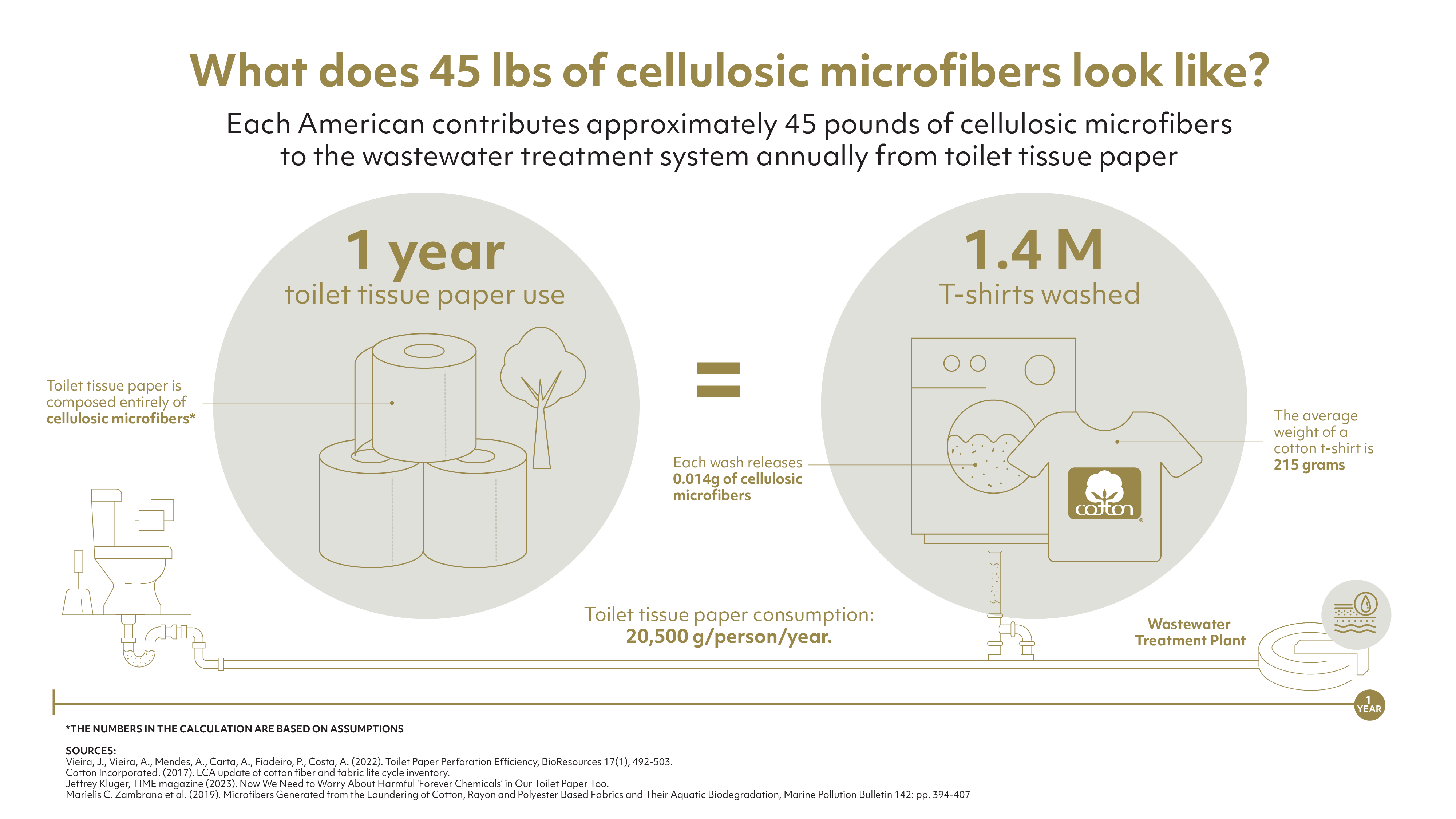 [1] Calculated based on these assumptions: 1. Tissue paper is composed entirely of microfibers 2. The average weight of a cotton t-shirt is 215 grams 3. The average toilet paper consumption in the US is 20,500 g/person/year. 4. On average, each t-shirt wash releases 0.014 g of microfibers per t-shirt.