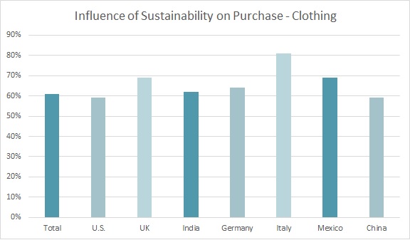 In other countries, sustainability is significantly more important than other purchase drivers such as quality and fit. This can be seen especially in some emerging nations — the countries that are most environmentally concerned, according to the Cotton Council International (CCI) and Cotton Incorporated Global Environment Survey. For instance, sustainability/environmental friendliness was a high priority for consumers in India (81 percent), China (60 percent), Mexico (69 percent), and Italy (62 percent), versus 46 percent for Americans and 42 percent of UK apparel shoppers.