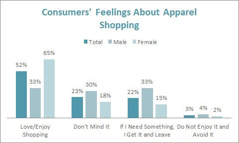 Slightly more than half (51%) of all consumers say they “love or enjoy” clothes shopping, up from 48% in 2011, according to the Cotton Incorporated Lifestyle Monitor™ Survey.  Women (63%) and those under 35 (61%) are more likely than their counterparts to enjoy shopping.