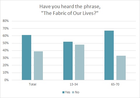 The advertising industry and business media are not the only ones recognizing the tagline. The majority of consumers (61 percent) have heard the phrase, “the fabric of our lives,” according to the Cotton Incorporated Lifestyle Monitor™ Survey. Women (70 percent) and those over 35 (67 percent) are significantly more likely to say they have heard the phrase. But even the majority of those aged 13-to-24 (52 percent) say they’ve heard the tagline.