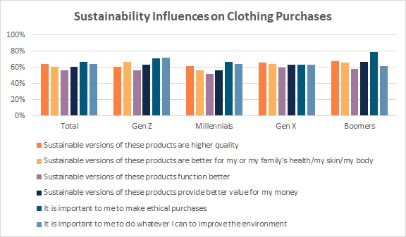 Among those who say sustainability influences their clothing choices, almost half (49 percent) say it is because it is important to them to do “whatever they can” to improve the environment, according to the 2023 Global Sustainability Survey. Shoppers also say it is important to them that products can return to the earth by being biodegradable (48 percent) and they feel sustainable versions of apparel are better for their health (39 percent).