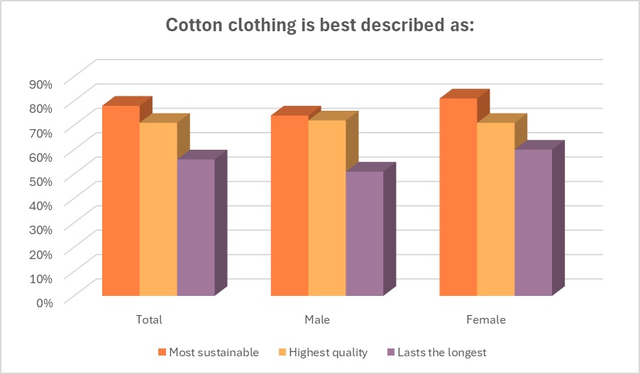The majority of male consumers (80 percent) say cotton clothing is the most sustainable, highest quality (75 percent) and longest lasting (61 percent), according to the 2023 Cotton Incorporated Lifestyle Monitor™ Survey. Further, nearly 8 in 10 male consumers (79 percent) say better quality garments are made from all-natural fibers such as cotton. Another 70 percent of men say they would rather buy apparel that is higher in quality than more fashionable (24 percent).