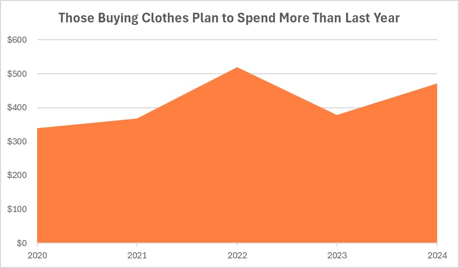 Consumers plan to spend an average of $472 on BTS clothes for the upcoming school season, according to Cotton Incorporated’s 2024 Lifestyle Monitor™ Survey. This is up from $378 in 2023 and down from $520 in 2022.