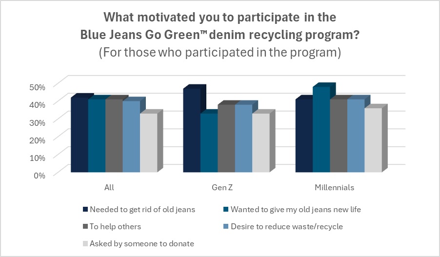 Nearly two-fifths of consumers (37 percent) say they have heard of or participated in the Blue Jeans Go Green™ program, according to Cotton Incorporated’s 2023 Consumer Circularity Survey. The reasons for participating in the BJGG program include needing to get rid of old jeans (42 percent), wanting to give their old jeans new life (41 percent), helping others (41 percent), and reducing waste/recycling (40 percent).