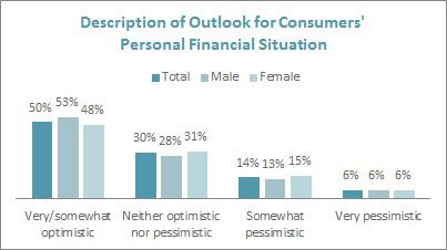 When looking at their own personal financial situation, 50% of consumers say they are “very or somewhat optimistic,” up from 48% in 2012 and 47% in 2011, according to the Monitor. Again, men (53%), consumers ages 25-34 (59%) and those making $75,000 or more per year (61%) are significantly more optimistic than the average consumer.