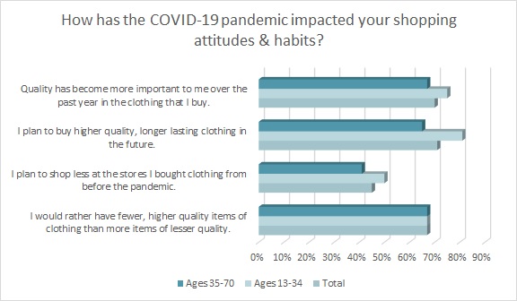 Now, it should be noted that 64 percent of all fashion shoppers, and most consumers under the age of 35 (54 percent), say they would rather buy clothes that are higher in quality than more fashionable, according to the 2021 Cotton Incorporated Lifestyle Monitor™ Survey. And more than one-third of all shoppers (35 percent) say sustainability and environmental friendliness is important to them when deciding on what clothes to purchase. Further, the majority says cotton clothes are the most sustainable (78 percent), highest in quality (71 percent), and last the longest (56 percent) when compared to manmade fiber clothing.