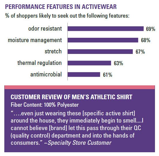 and brands seize opportunities to improve product performance. The majority of consumers (52%) say they are more likely to shop at a store offering athletic apparel that can be worn all day long. The ability of athletic apparel to integrate into a consumer’s daily routine depends on comfort and a variety of performance factors. More than 6 in 10 consumers say they are very or somewhat likely to look for odor resistant, moisture management, stretch, and thermal regulation features in their athletic apparel. Shoppers may recognize that these features can help improve the comfort and fit of their active clothing.